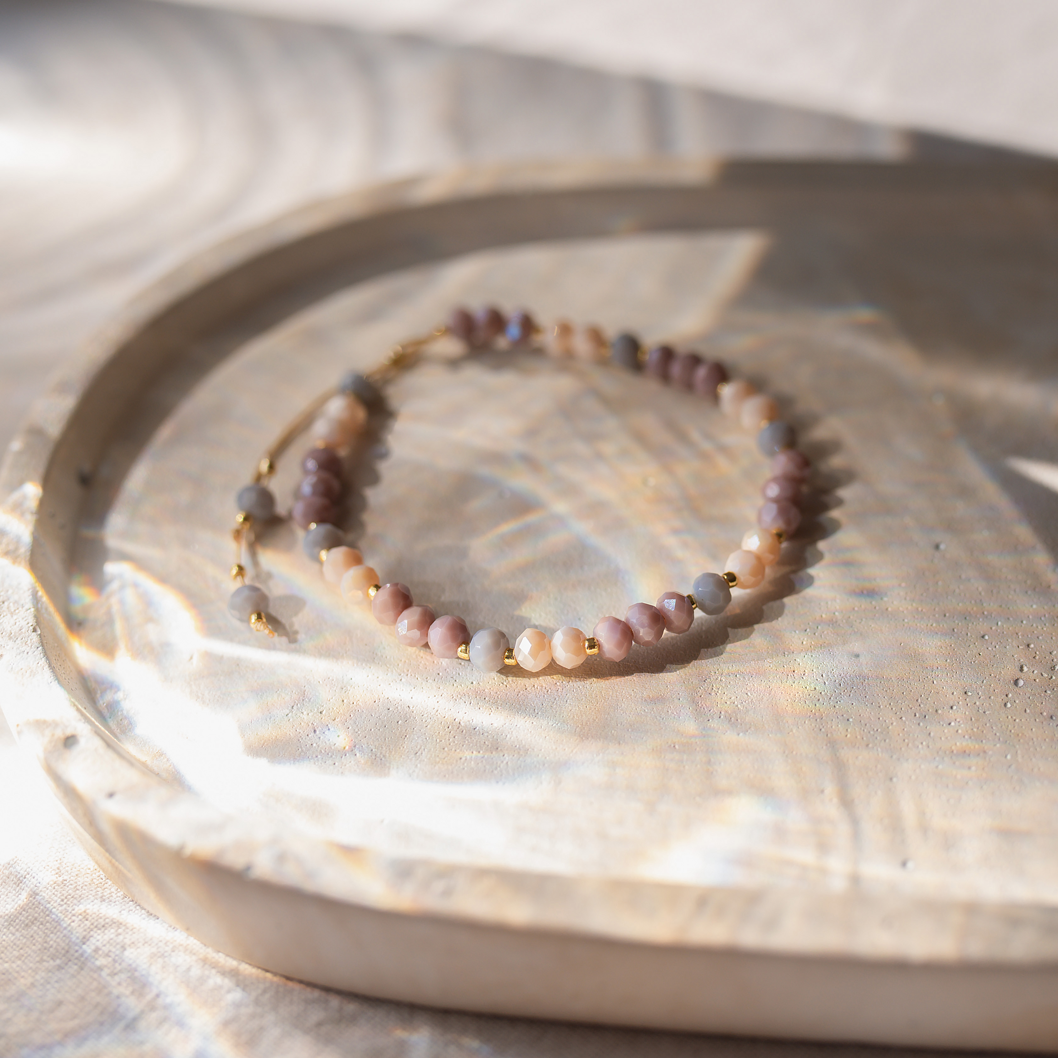 Fasetowane szklane koraliki delikatnie odbijają światło, nadając blasku i sprawiając, że bransoletka wygląda świeżo i stylowo.